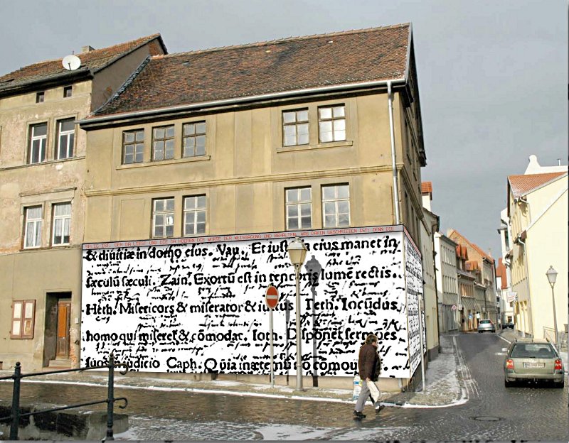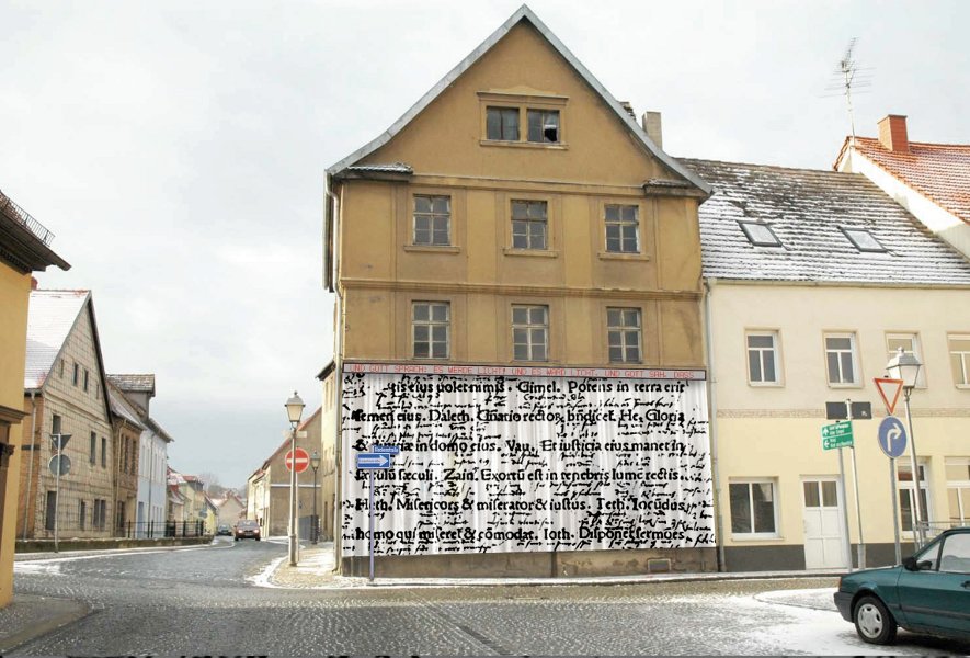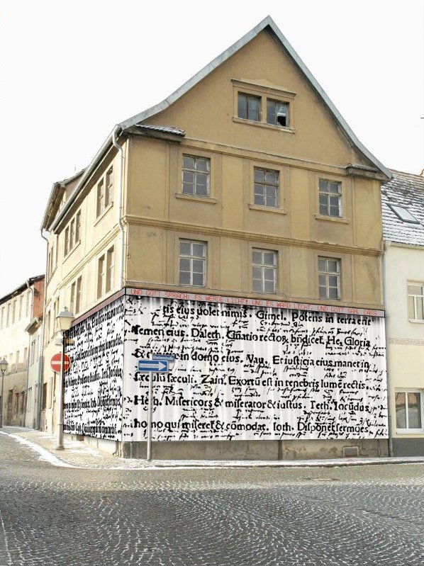Die Installation beschränkt sich auf den unteren Teil des leerstehenden Gebäudes. Das Bauwerk erhält im Bereich des Erdgeschosses bis zur Fensterbrüstung des Obergeschosses eine Art zweite Haut. Der Vorhang aus Tyvek-PE-Vlies verhüllt die Hausfassade und die zugemauerten Fenster. Das papierähnliche Gewebe ist einfarbig schwarz bedruckt. Der Druck zeigt eine vergrößerte Reproduktion einer Handschrift Martin Luthers (Wolfenbütteler Psalter 1513–1515).